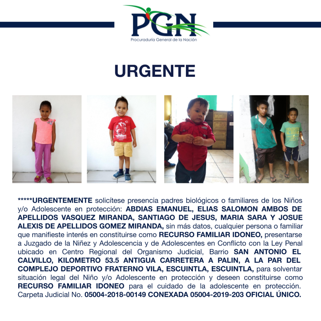 ABDIAS EMANUEL, ELIAS SALOMON AMBOS DE APELLIDOS VASQUEZ MIRANDA, SANTIAGO DE JESUS, MARIA SARA Y JOSUE ALEXIS DE APELLIDOS GOMEZ MIRANDA PGN Comunicación Social hace 5 años ABDIAS EMANUEL, ELIAS SALOMON AMBOS DE APELLIDOS VASQUEZ MIRANDA, SANTIAGO DE JESUS, MARIA SARA Y JOSUE ALEXIS DE APELLIDOS GOMEZ MIRANDA Por: Comunicación Social Comparte en redes sociales